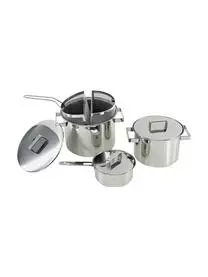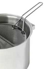 Dieses siebenteilige Koch-Set besteht aus drei Kochtöpfen, drei Deckeln, und einem zweiteiligen Netzkorb. Die Kochtöpfe sind für alle Herdarten inklusive Induktion geeignet.