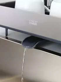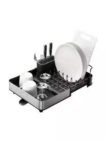 Dieses ausziehbare Abtropfgestell verfügt über einen dreifach verstellbaren Wasserauslauf und einem herausnehmbaren Besteckabtropfer inklusive Messerfach.