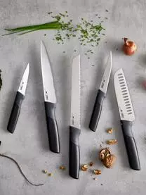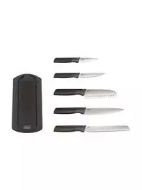 Das sechsteilige Set umfasst eine Reihe von unverzichtbaren Küchenmessern, mit Klingen aus japanischem Edelstahl. Der schlanke Messerblock nimmt viel weniger Platz auf der Arbeitsfläche in Anspruch als herkömmliche Messerblöcke. Das Set besteht aus einem Schälmesser, Santokumesser, Gemüsemesser, Kochmesser, Brotmesser und einem Messerblock.