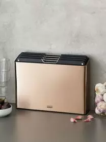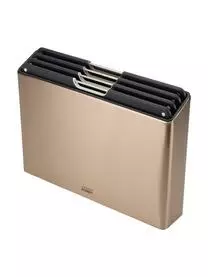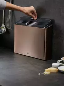 Dieses Set enthält vier farbcodierte Schneidebretter, die in ihrem schlanken Gehäuse schön organisiert aufbewahrt werden können. Die doppelseitige Platten mit messerfreundlichen, strukturierten Schneidflächen verfügen über rutschfeste Füße.