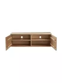 Dieses Sideboard aus MDF mit Eschenfurnier zeigt sich wahlweise schwarz lackiert oder mit einem klaren Lackfinish, das die Maserung gut zur Geltung bringt. Die beiden Türen haben eingefräste Längsrillen, die für einen Streifeneffekt sorgen. Dank der Push-Funktion lassen sie sich mühelos öffnen und schließen, und die Front bleibt clean und glatt. Da das Modell an der Wand hängt, ist es überaus ansprechend und zugleich praktisch. Nur dein Geschmack entscheidet über die Montagehöhe des Schranks, und darunter lässt es sich mühelos sauberhalten. Auch als TV-Bank sehr zu empfehlen, denn damit kannst du die ideale Höhe für deinen Fernseher wählen. Hinter den Türen verbirgt sich jeweils ein Einlegeboden. Solltest du den Schrank als Medienmöbel nutzen wollen, ist auf der Rückseite eine Öffnung für die Kabel vorhanden.