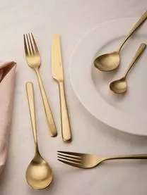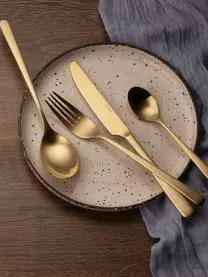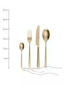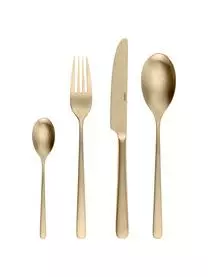 Dieses 16-teilige Besteck-Set besteht aus je vier Tafelgabeln, Tafelmessern, Tafellöffeln und Teelöffeln.