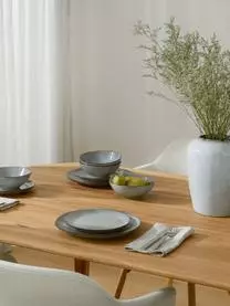 Das handgefertigte Geschirr-Set besteht aus zwei Schalen, zwei Servierplatten und zwei Dipschälchen in unterschiedlichen Designs.