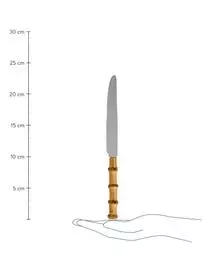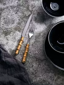 Dieses zwölf-teilige Besteck-Set mit Bambusholzgriffen besteht aus sechs Tafelgabeln und sechs Tafelmessern.