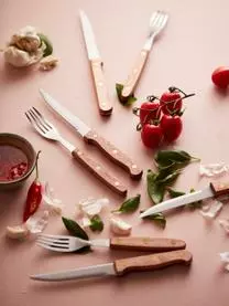 Dieses Besteck-Set besteht aus sechs Tafelgabeln und sechs Tafelmessern.