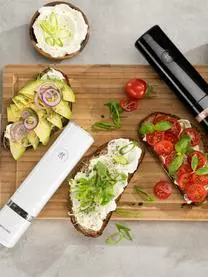 Die elektrische Pfeffer- und Salzmühle mit Keramikmahlwerk und einem Mahlgrad von fein bis grob verfügt über ein Sichtfenster und über eine integrierte LED-Beleuchtung.